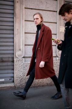 While designers have tried to buck the trend of slim-cut pants in favour of flowing, loose-fitting ones, the men about town remain faithful to their tapered silhouettes, preferring excess cloth only in statement-making outerwear. But just like the runway, it seemed much more like summer than winter, what with the brilliant array of colours seen on the streets. All the better for a city known for its gloomy industrial façades.